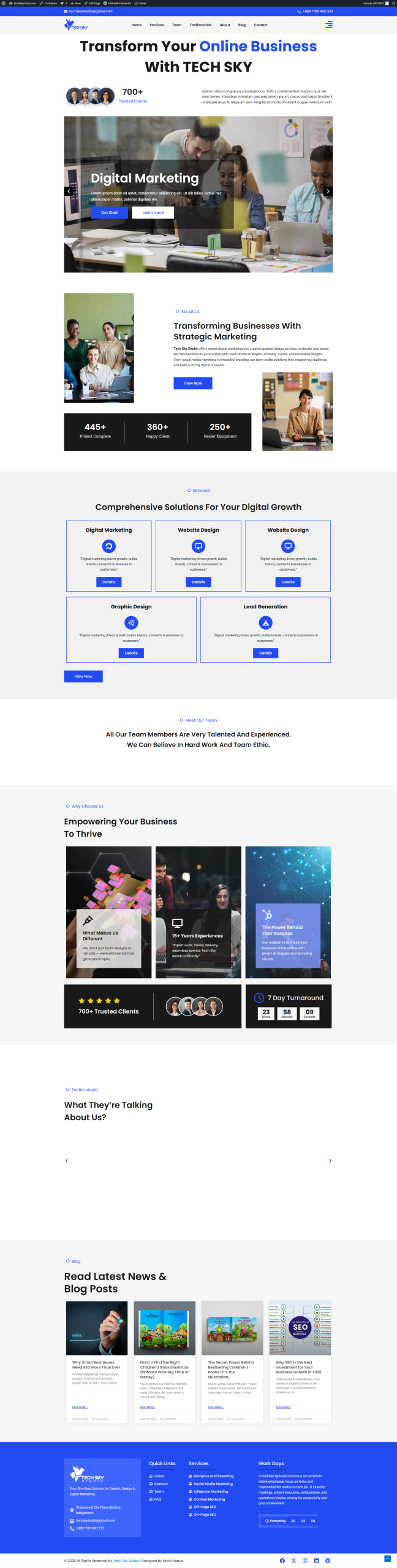 Tech Sky Studio offers expert digital marketing and creative graphic design services to elevate your brand. We help businesses grow online with result-driven strategies, stunning visuals, and innovative designs. From social media marketing to impactful branding, our team crafts solutions that engage your audience and build a strong digital presence.